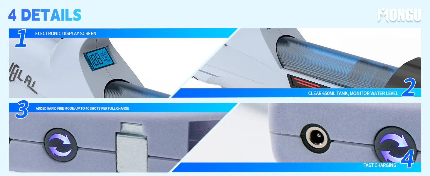 - High-capacity tank for fewer refills and longer play